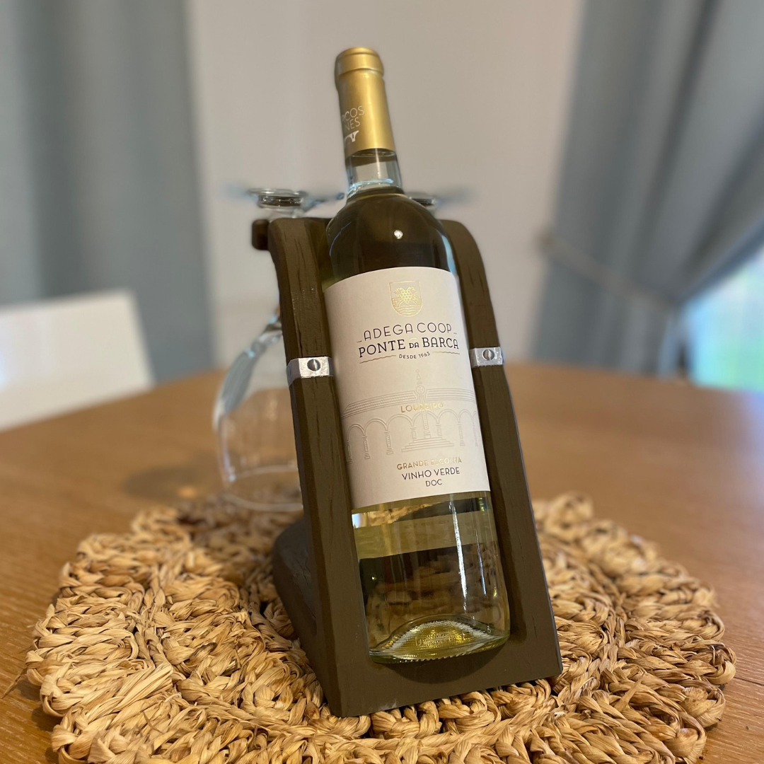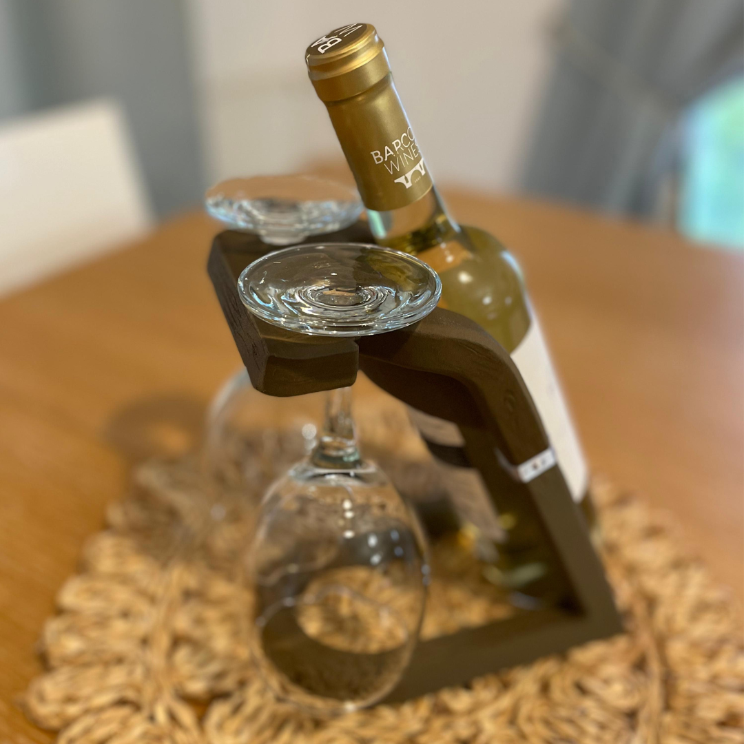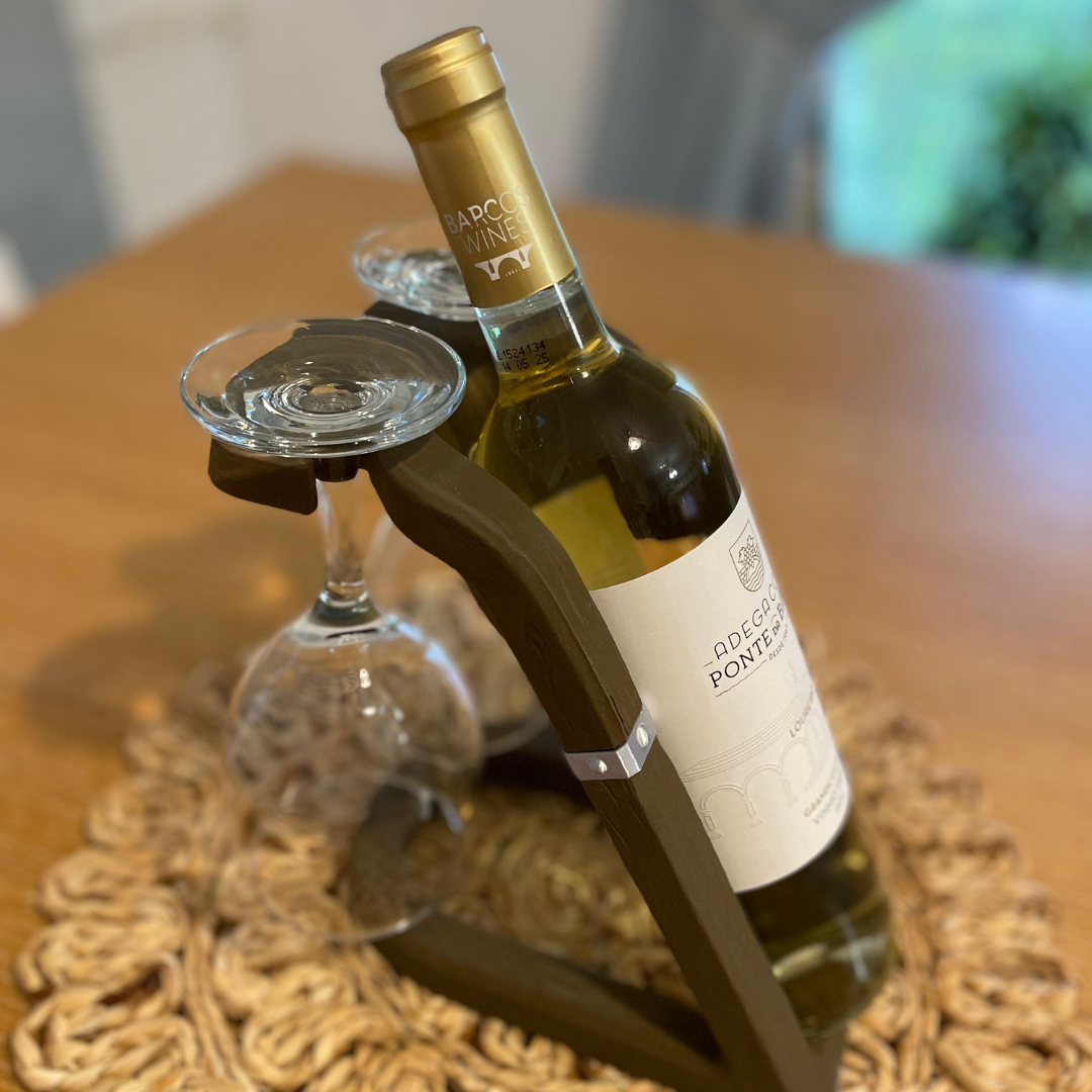 Dieser stilvolle Weinhalter vereint moderne 3D-Druck-Technologie mit klassischem Design. Gefertigt aus hochwertigem Holz-ähnlichem Filament, sieht er täuschend echt wie aus massivem Holz gearbeitet aus. Er bietet Platz für eine Weinflasche sowie zwei Gläser, die kopfüber eingehängt werden können – das wirkt nicht nur elegant, sondern schützt das Glas auch vor Staub.